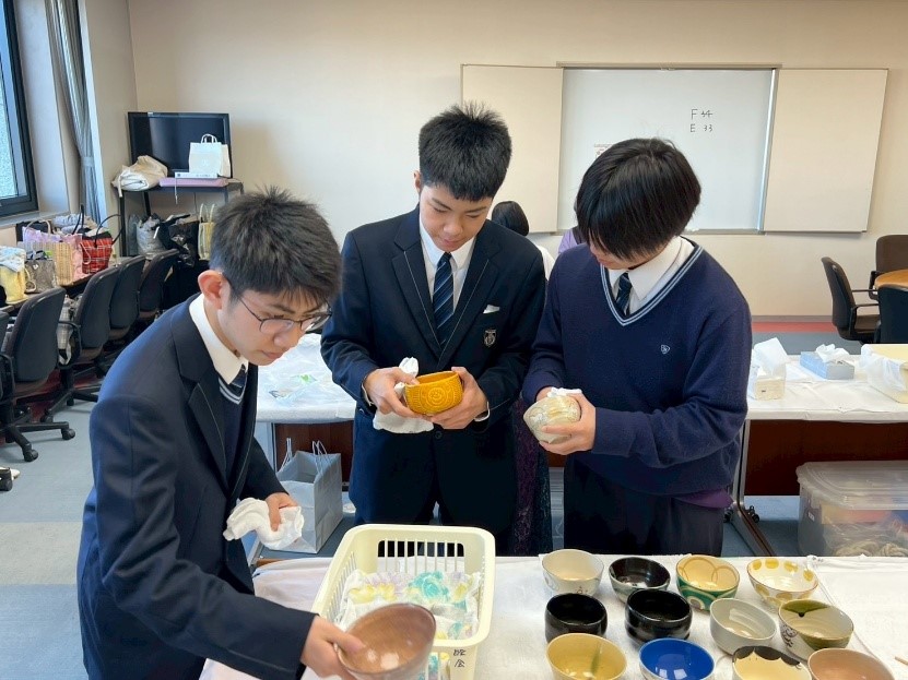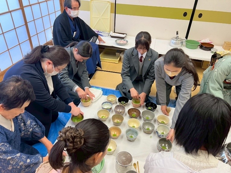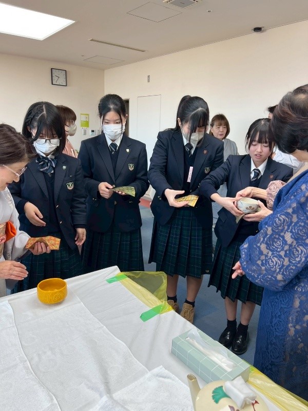 お客様として参加した生徒たちは初めてのお茶会で、きれいな着物姿や、お点前・席主・半東・お運びなどの役割、それぞれの美しい所作、落ち着いた雰囲気の中で頂いたお菓子とお茶を堪能出来たようです。