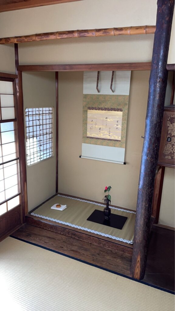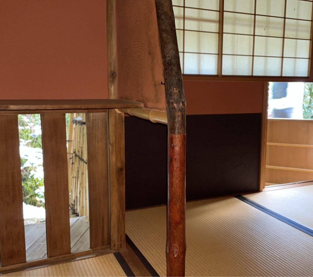 床:落し掛けが竹と木材の二重になった珍しい形式。墨蹟窓は溜精軒の風炉先の下地窓と同じく柄杓の柄を用いた窓で、玄々斎好み