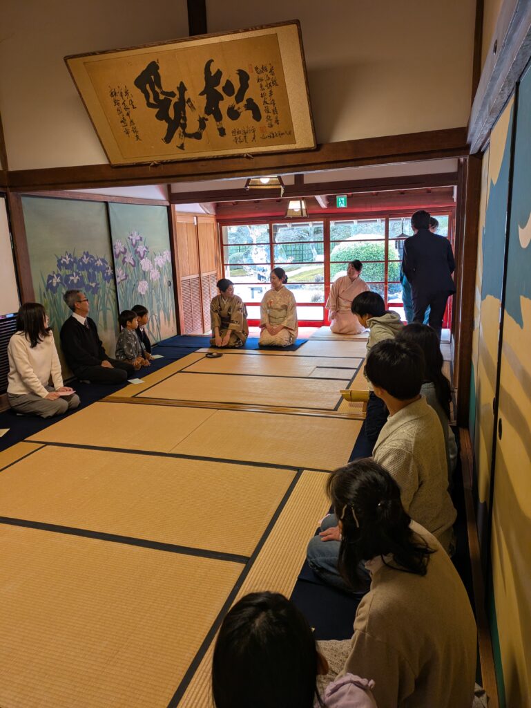 青年部会員と参加者が共にお辞儀のしかた、立ち方、座り方、襖の開け閉め、お茶とお菓子のいただき方を学び、席入りをしました。