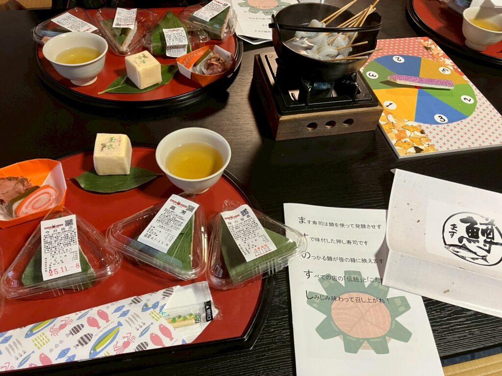 点心席は江戸時代から続く老舗旅館の宮田旅館にて、富山名産「ますのすし」や「あんばやし」をいただきました。ますのすしの歴史は古く、平安時代の「延喜式」に朝廷に献上されていた記録があるそうです。本大会の前の6月に富山・高岡・魚津青年部合同で「ますのすし食べ比べイベント」を開催され、参加された青年部会員の皆さんの評価とコメントが記された冊子もあり、浜松青年部でもこのような食べ比べイベントを行えたらなと思いました。また、今回初めて知ったのが「あんばやし」というこんにゃく料理で、薄く三角に切ったこんにゃくを竹串に刺して茹で、生姜の効いいた味噌だれでいただきます。富山では屋台の縁日などでルーレットを回して出た数だけ食べられるという楽しみ方があるそうで、手作りのルーレットも用意されており私たちも楽しむことが出来ました。